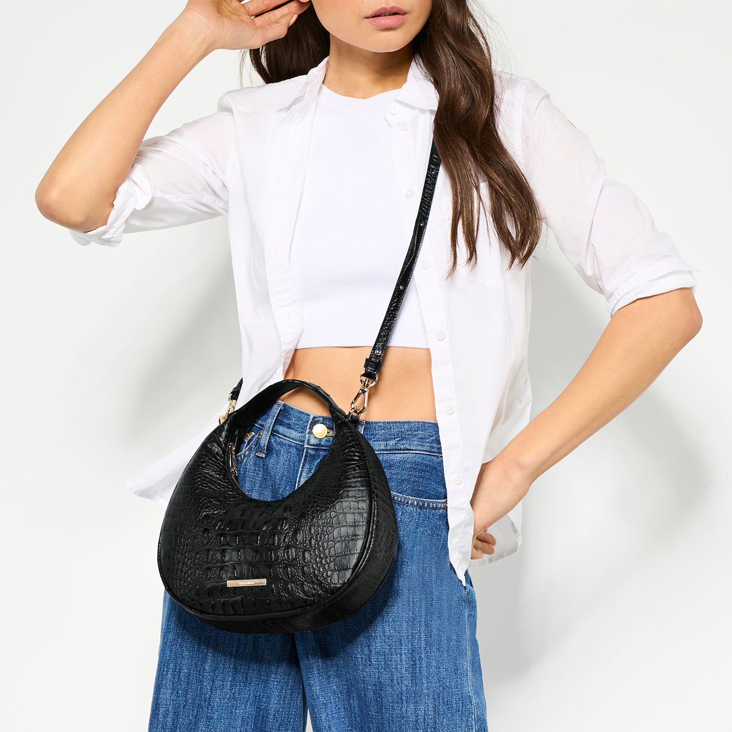 Mindy in our Alden Road leather, a lightweight, soft iteration of our iconic croc-embossed leather with casual construction that appeals to your softer side. A small trending crescent shaped crossbody bag with a soft, slouchy silhouette for low-key luxury. The size is perfect to carry as a shoulder bag or use the adjustable strap to wear as a hands-free crossbody.