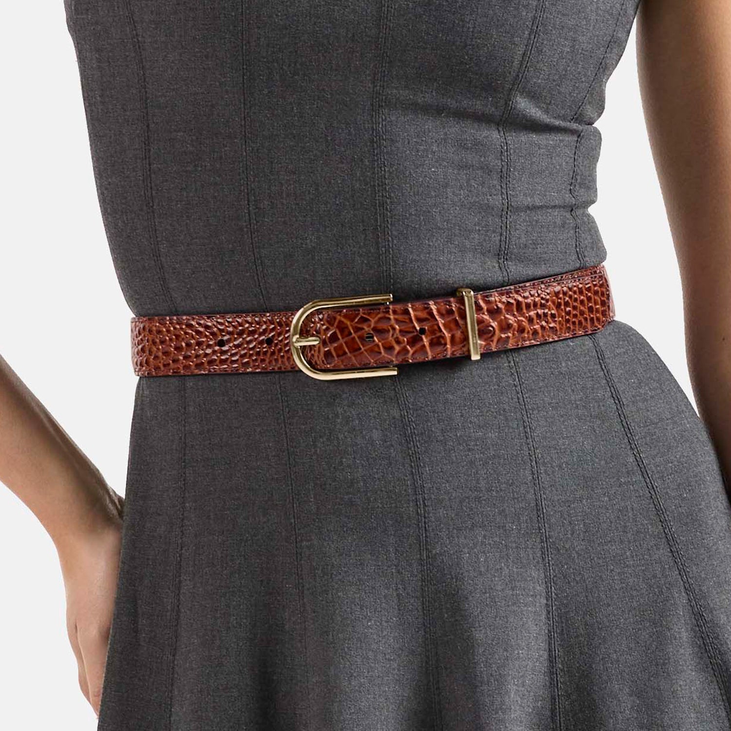 The Medium Leather Gold Buckle Belt is designed to add an elevated accent to any ensemble. The belt brings just a hint of color to your look. The embossed logo design is a Brahmin signature. Made with genuine leather.