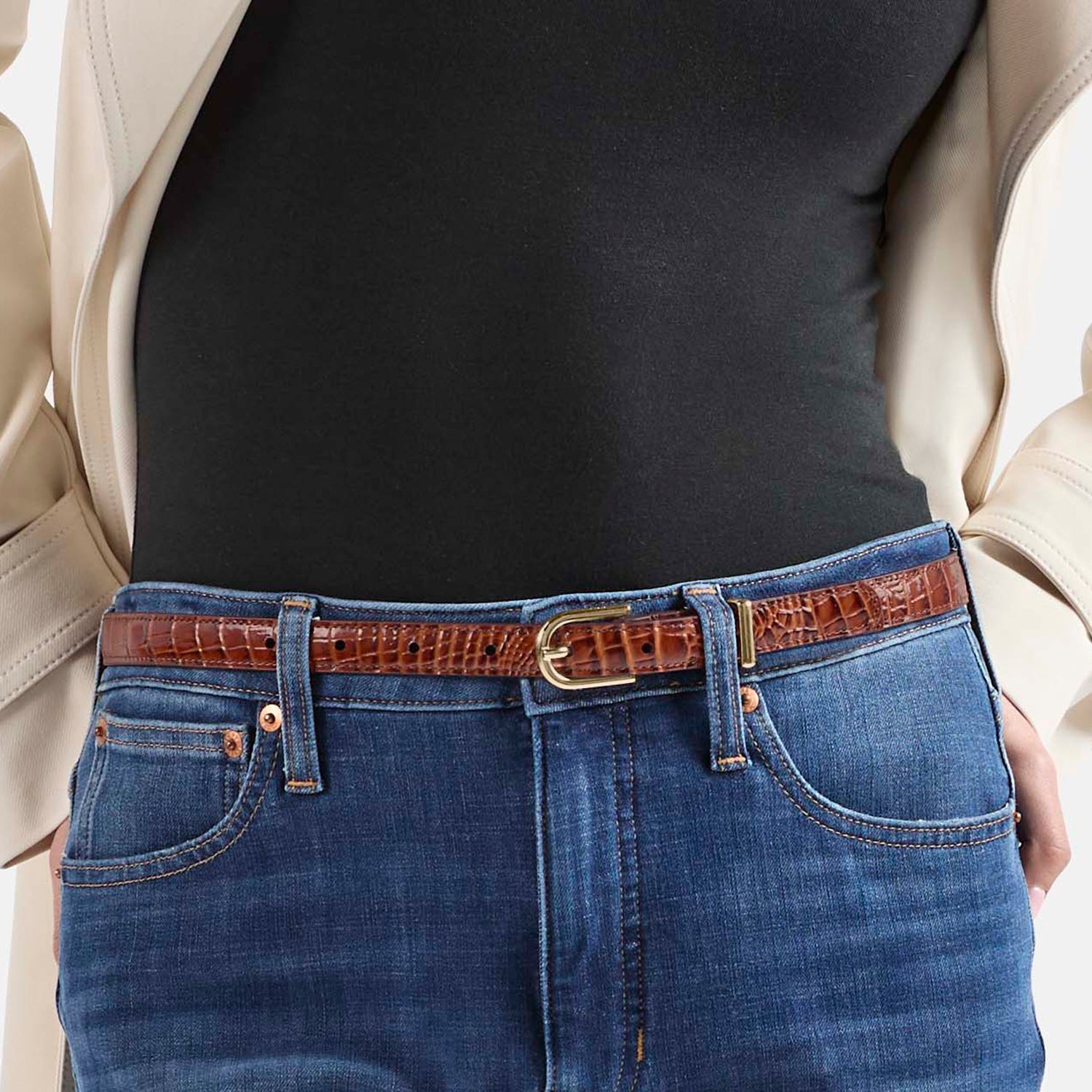 BRAHMIN Women’s Skinny Leather Gold Buckle Belt | Black Classic Croc