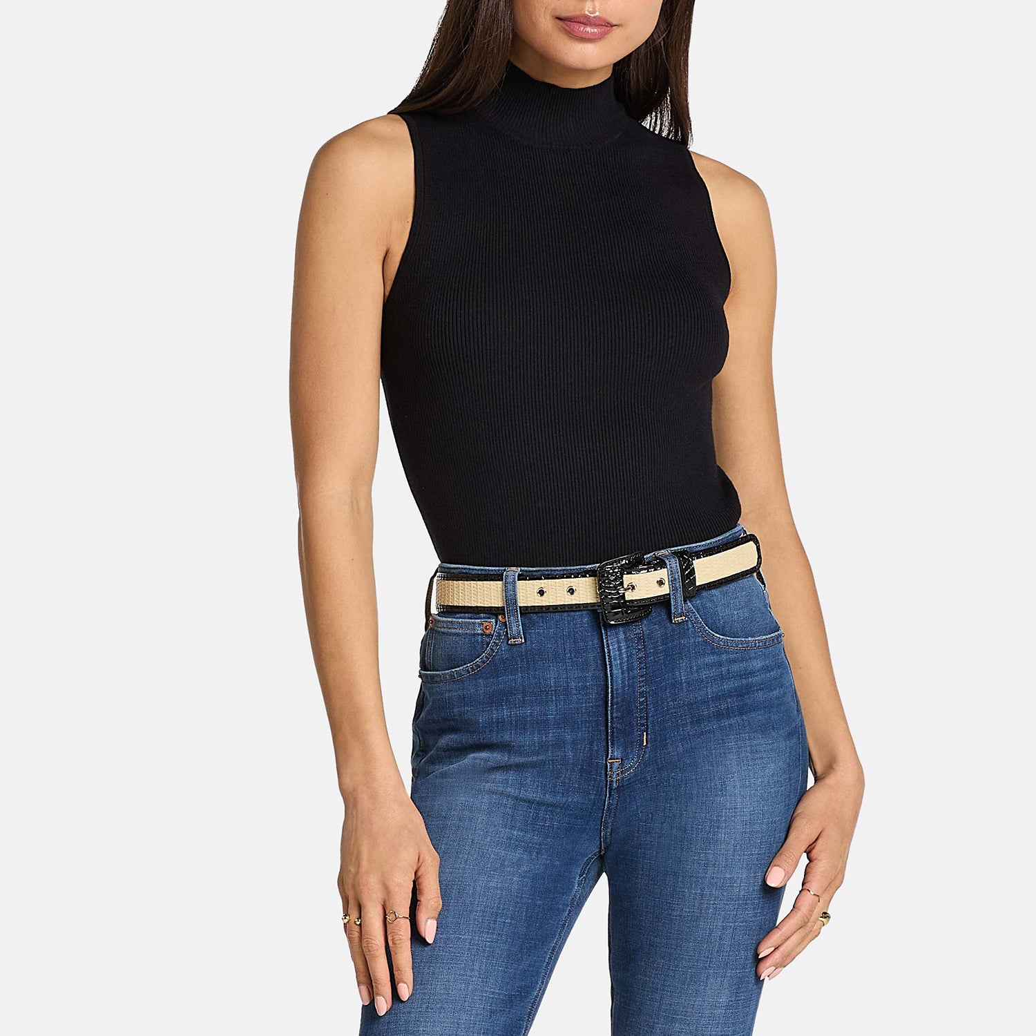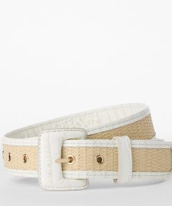 The Wide Covered Leather Buckle Belt is designed to add an elevated accent to any ensemble. This iteration of wide width belt features straw, our favorite texture of the season, and combines it with our iconic Melbourne leather. The embossed logo design is a Brahmin signature. Made with genuine leather.